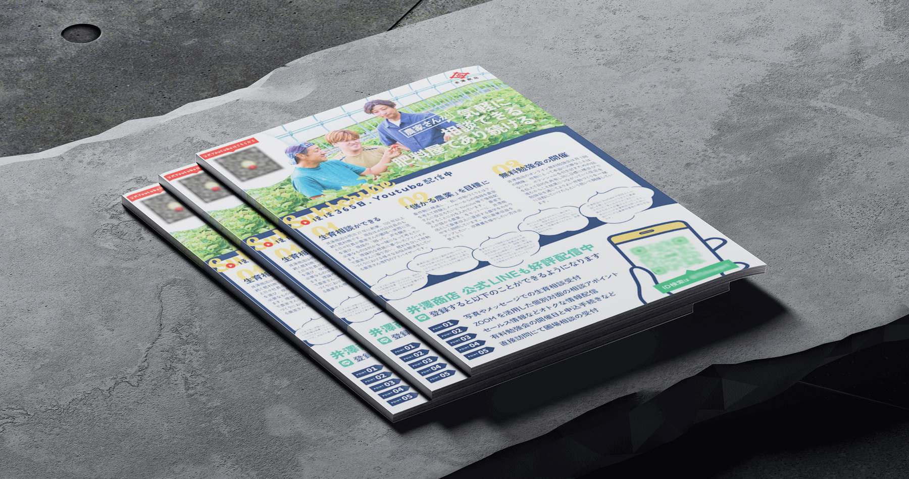 具体的に公式LINEとYouTubeチャンネルへ簡単にアクセスできるようQRコードを配置。加えて、企業様の活動内容や口コミを盛り込みたいとのご希望がありましたので、情報が煩雑にならないよう複数のレイアウト案を検討し、全体のバランスを取りながらデザインをまとめました。